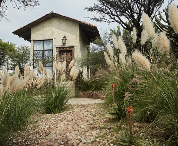 Celestia is a stand alone King Bed casita with Sagrada’s iconic detached open air bathroom shared with another casita. Or there is an additional indoor bathroom located close by. This room features floor to ceiling windows overlooking the Garden of the Giant Jars and a balcony with a valley and sunset view