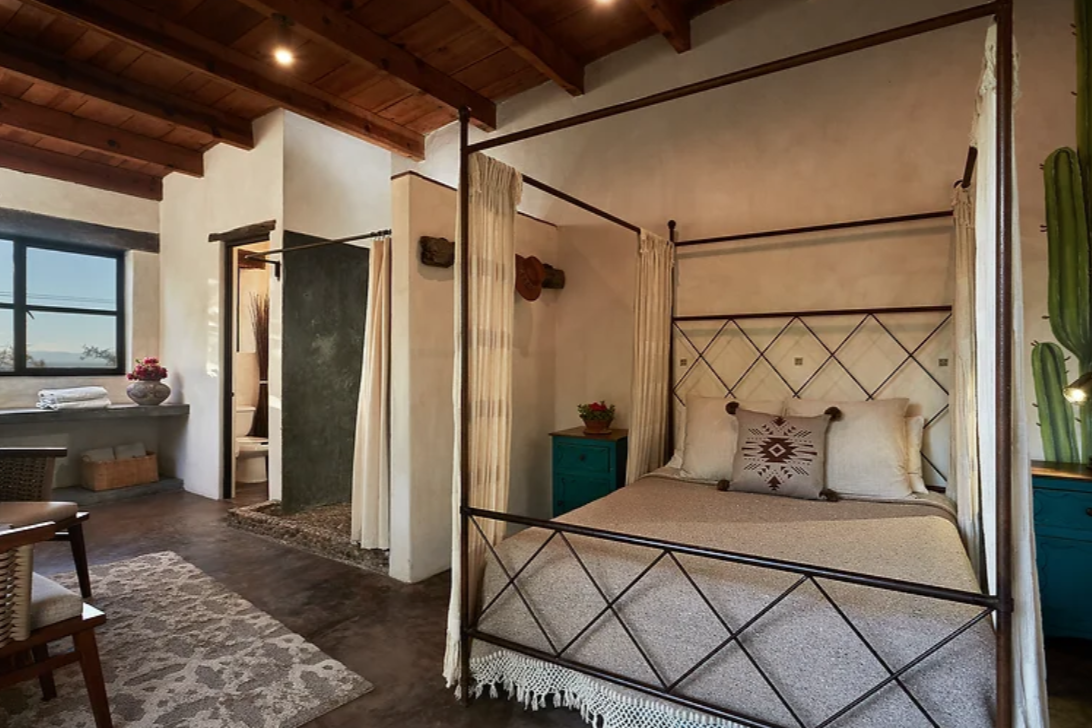 Clementina is a stand alone King Bed casita with Sagrada’s iconic detached open air bathroom shared with another casita. Or there is an additional indoor bathroom located close by. This room features floor to ceiling windows and a balcony with a valley and sunset view.